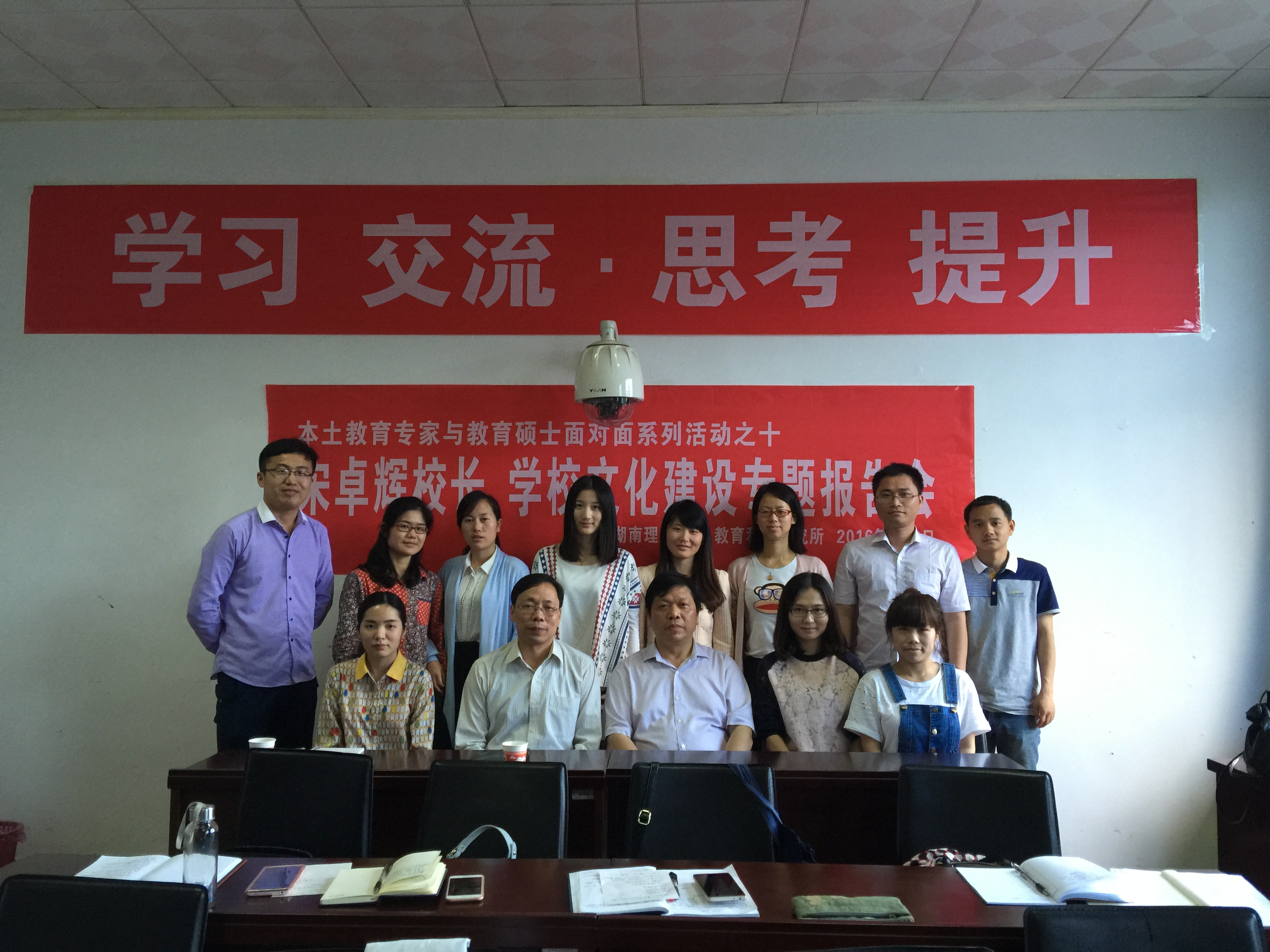 6月2日上午,由教育硕士专业学位点组织的“本土教育专家与教育硕士面对面”系列活动之十在1号教学楼教育管理专业硕士学术活动室举行。本次活动邀请了岳阳市教育实践领域专家、中学特级教师、湖南省示范性高中——岳阳市第十五中学董事长宋卓辉作“董事长素质与公司品牌建设”的主题报告,教育科学研究所部分教师及2015级全体教育管理专业学位研究生参加。