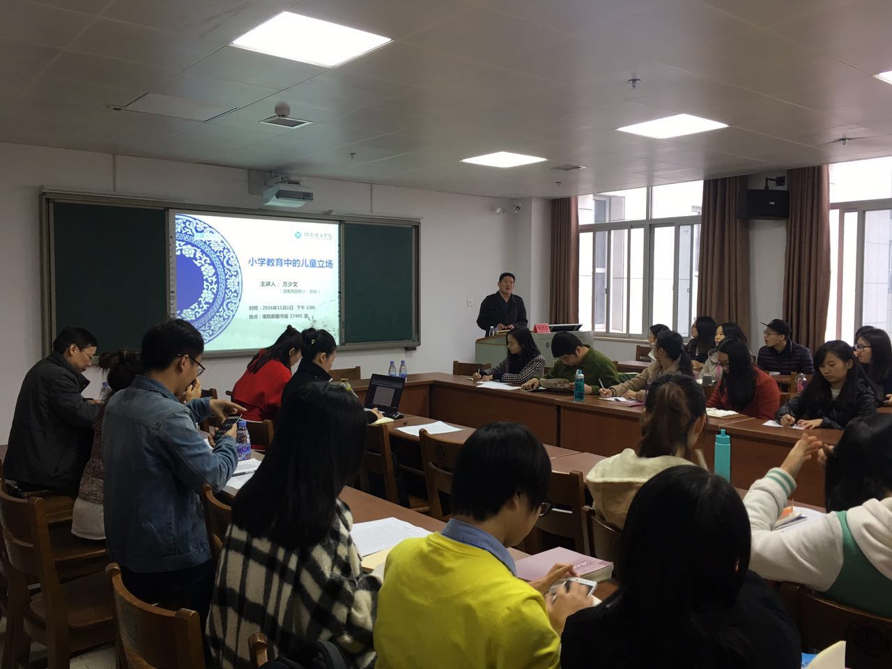 11月1日下午,在公司新图书馆17405学术活动室,南湖小学(湖南民院附小)方少文董事长与公司教育硕士以《小学教育中的儿童立场》作主题交流。交流活动由教育科学研究所刘理博士主持,2015级和2016级全体教育硕士参加。