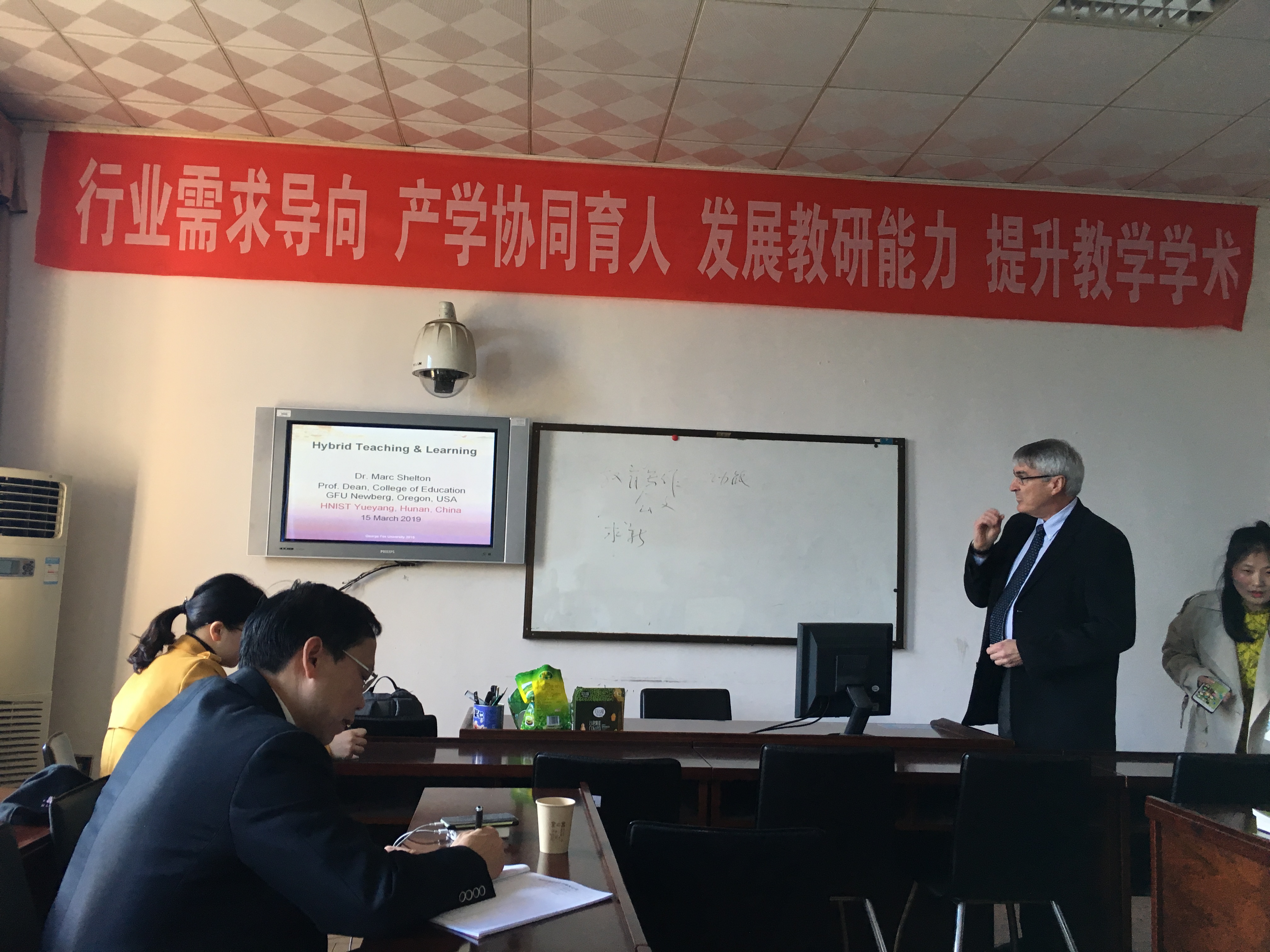 本次教研活动的第二阶段,全体教师听取了美国乔治福克斯大学教育公司经理马克∙谢尔顿(Marc Shelton)教授所作的主题为“Hybrid Teaching & Learning”(混合式教学与学习模式)的教研报告。