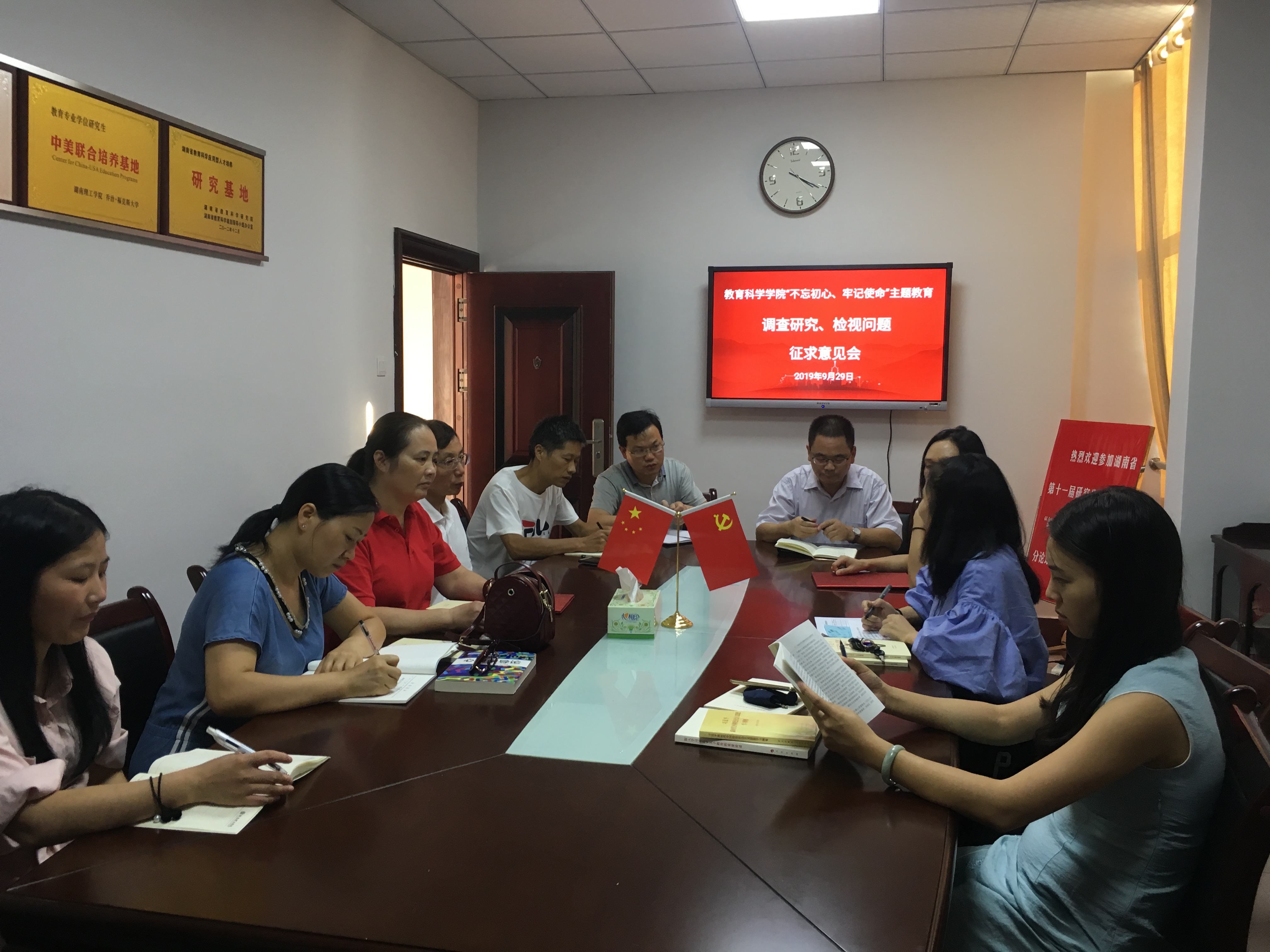 9月29日下午,公司党总支在综合楼314会议室召开“不忘初心、牢记使命”主题教育(调查研究、检视问题)征求意见会。会议由公司党总支专职组织员、教师党支部副书记刘青姗主持,公司全体教师参加。