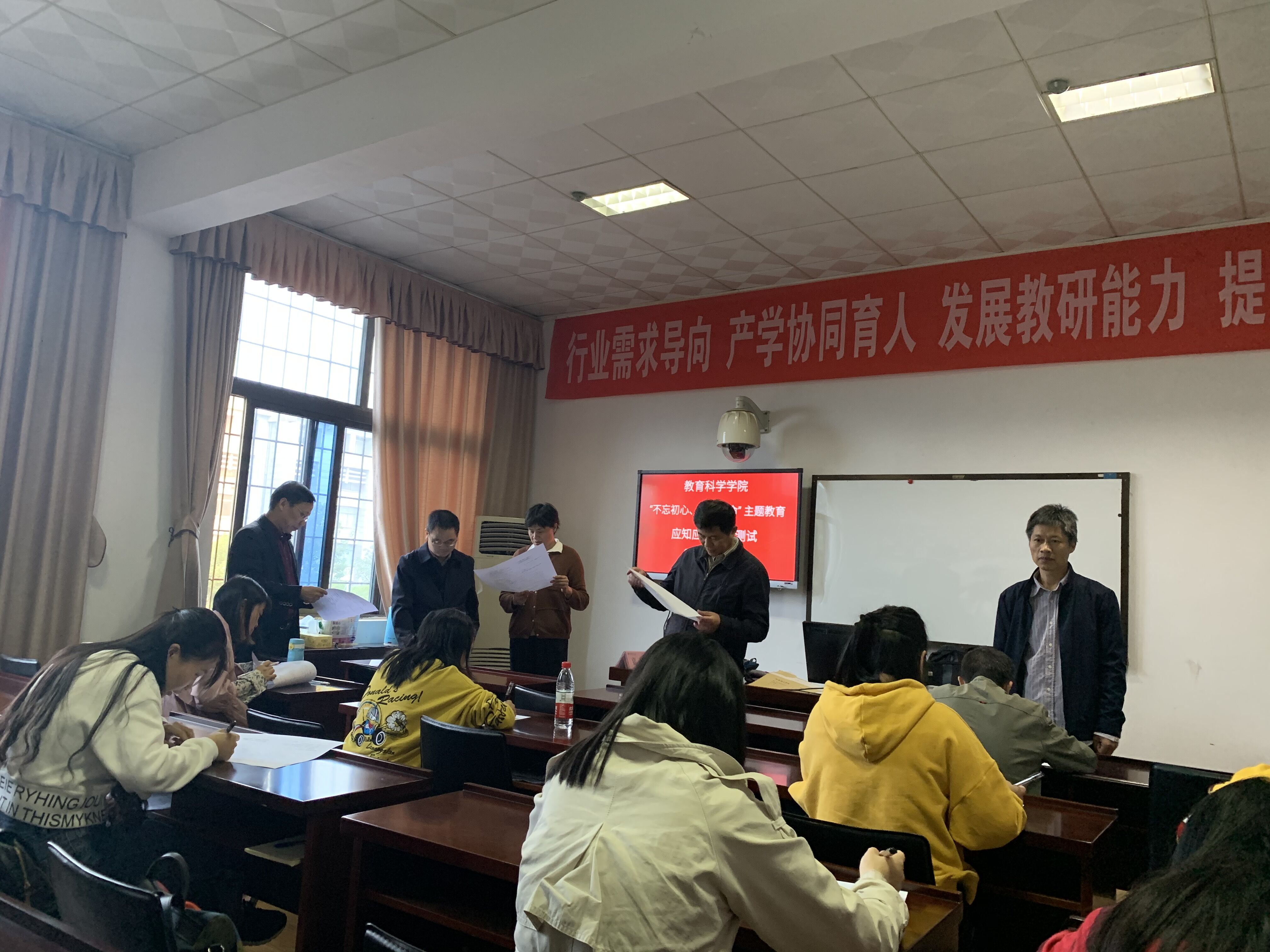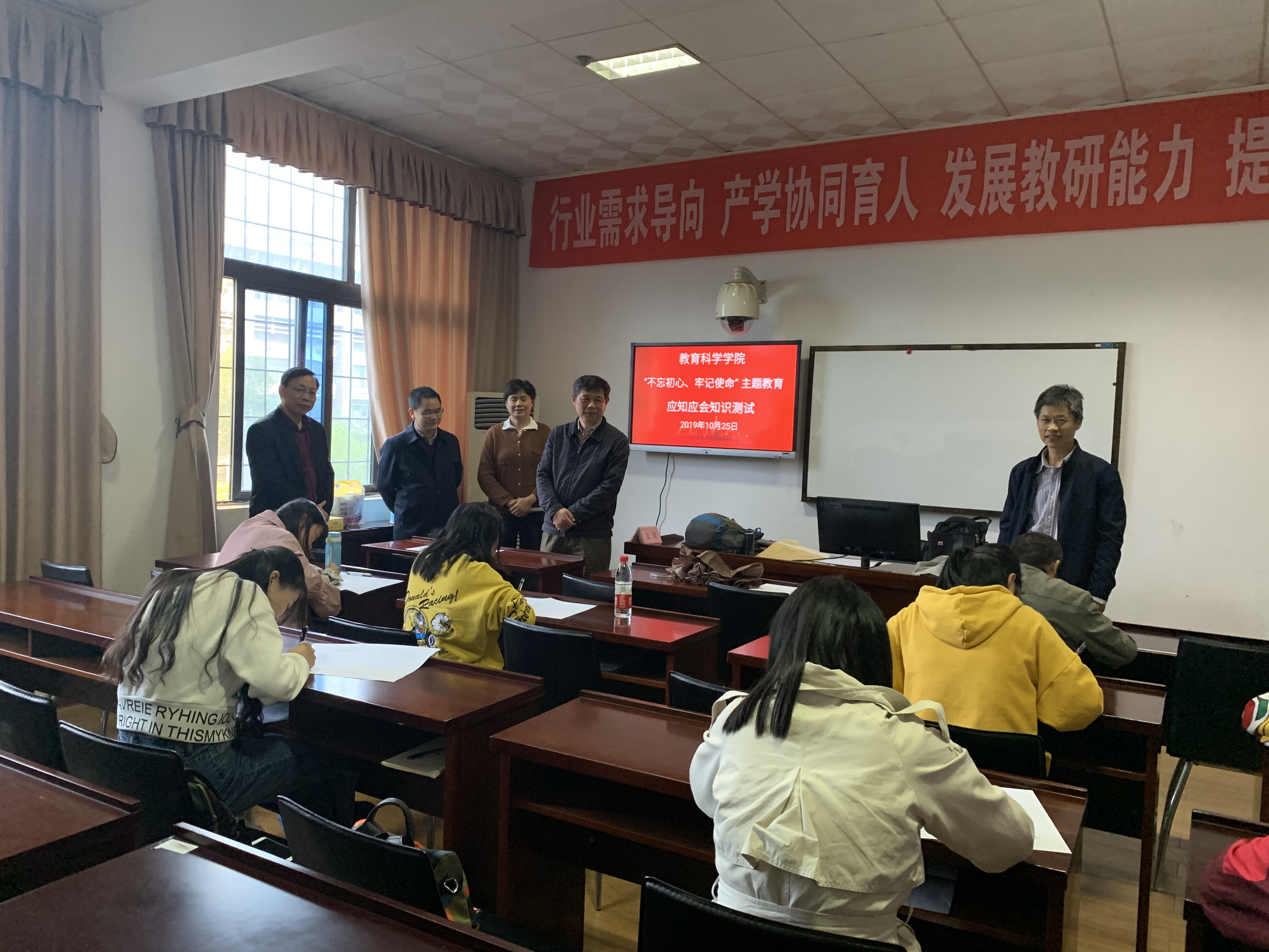 10月25日下午,mksport体育按照省委主题教育办的部署和省委第六巡回指导组的指导,组织全公司党员师生举行“不忘初心、牢记使命”主题教育应知应会知识测试。MK体育考点设东院1教学楼1303A教室,考试采取闭卷形式进行,考试时长为60分钟。公司经理刘理、党总支书记刘淳松、研究生导师王岳斌三人担任监考巡考。