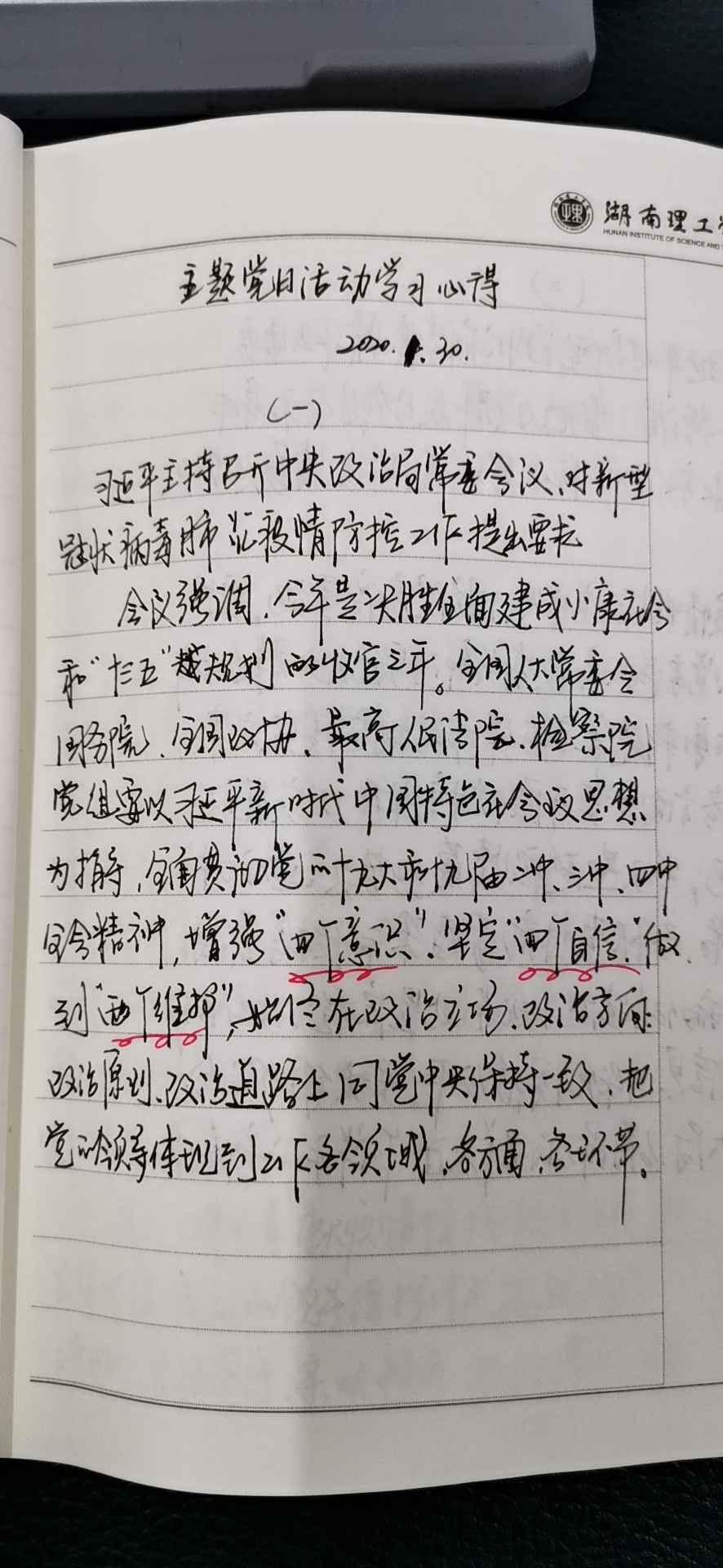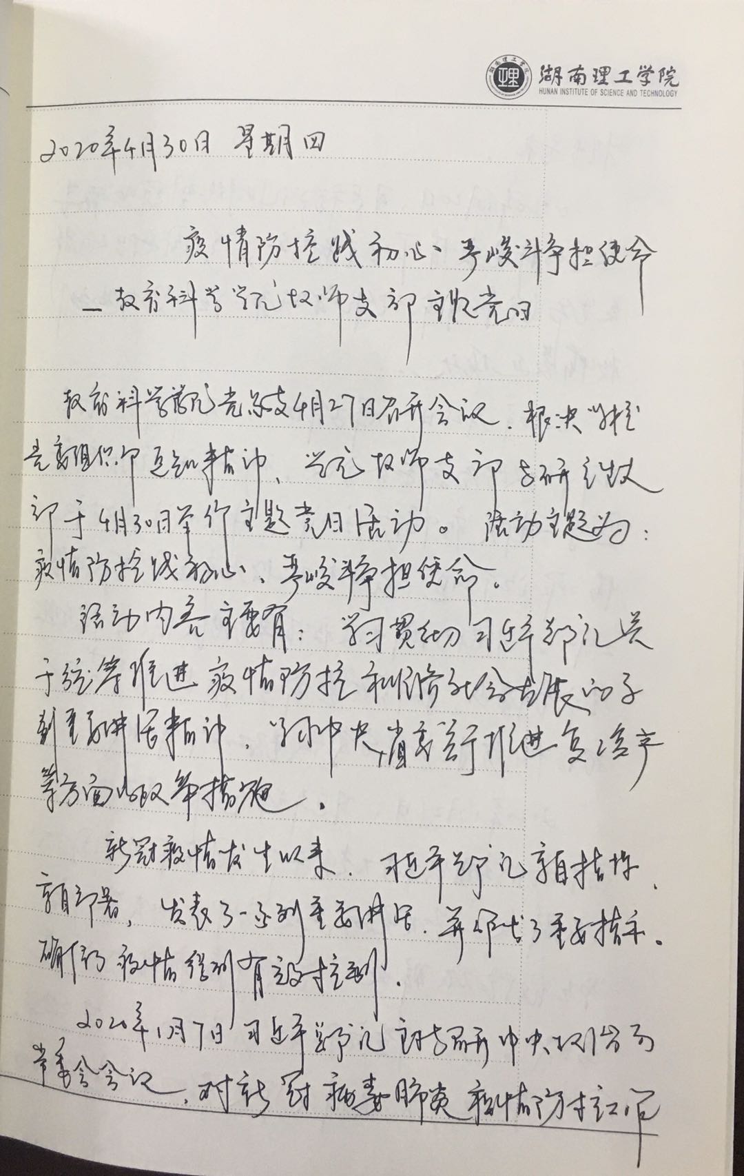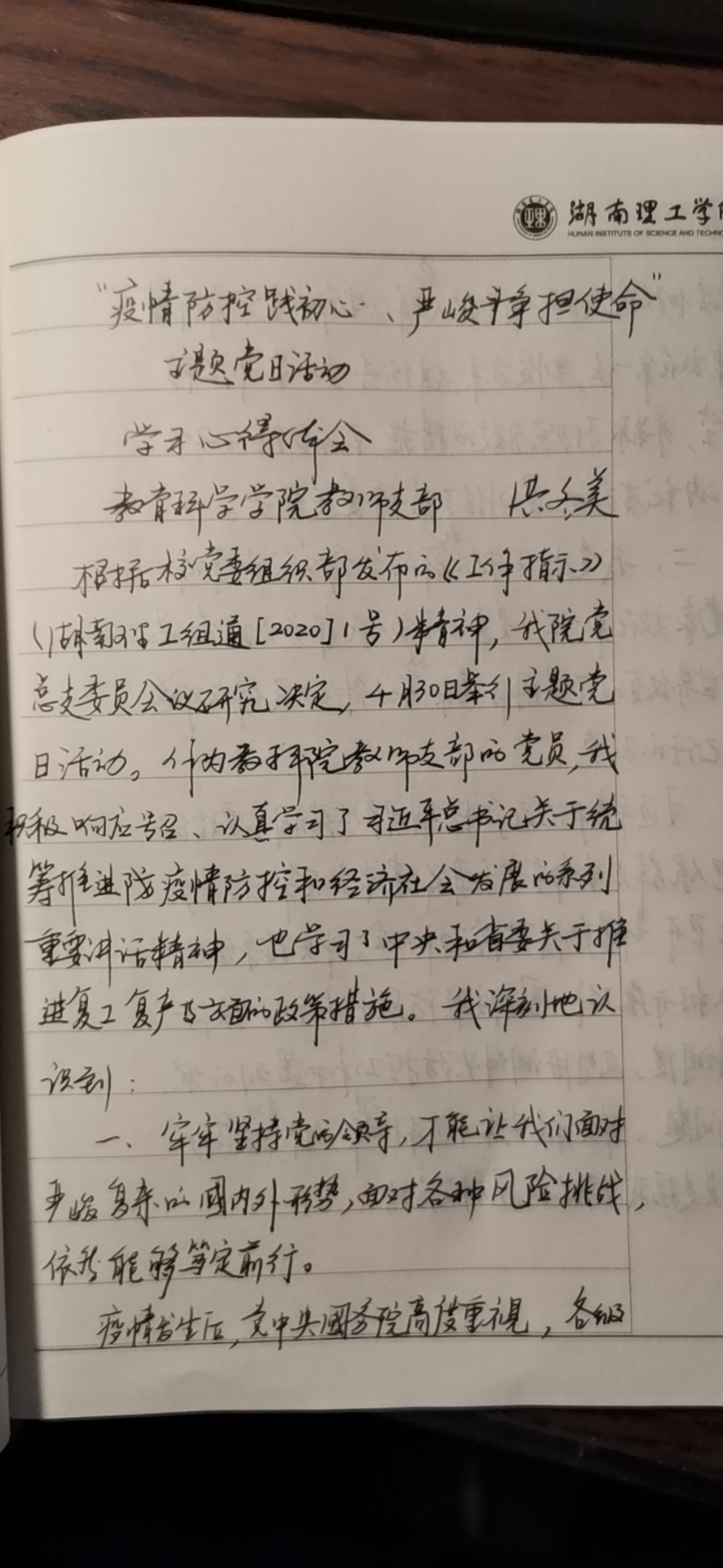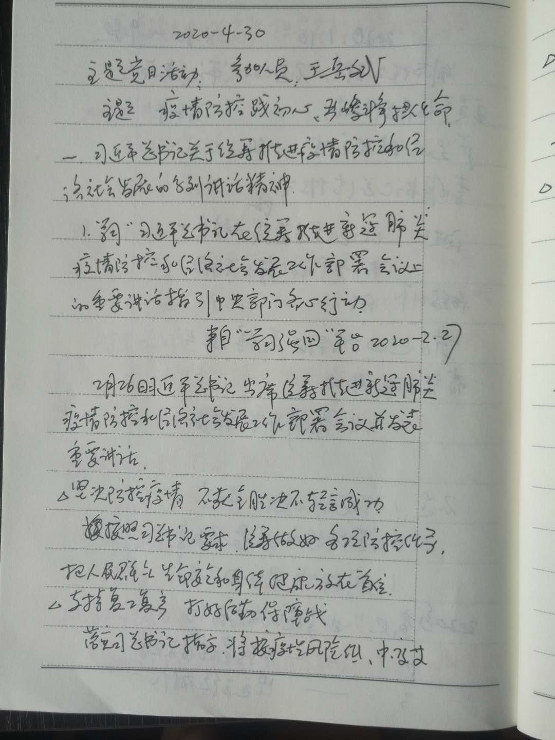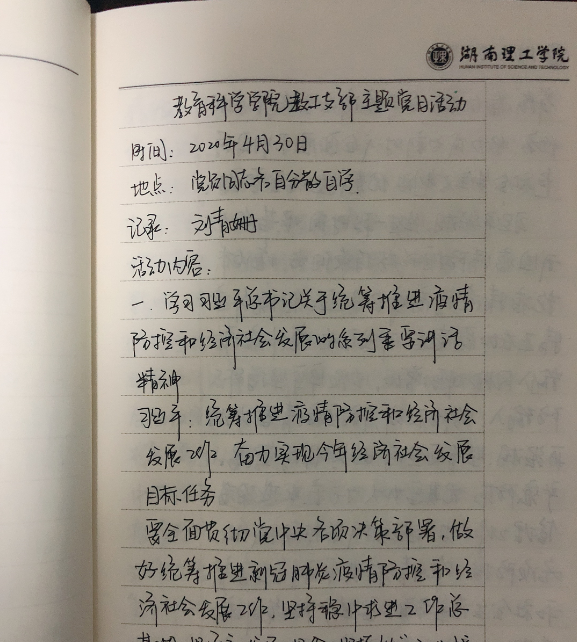 根据公司党委组织部发布的《工作提示》(湖理工组通[2020]1号])精神和公司党总支会议要求,4月30日,MK体育教师支部组织全体党员开展“疫情防控践初心、严峻斗争担使命”主题党日活动。支部全体共产党员参加并认真学习,做好学习笔记并撰写学习心得。