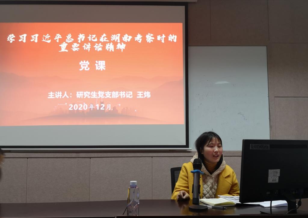 12月1日上午,MK体育研究生党支部“学习习近平在湖南考察时期重要讲话精神”专题党课在1号教学楼1302教师开讲,公司研究生党支部书记王炜主讲。全体研究生党员及党外员工参加学习。