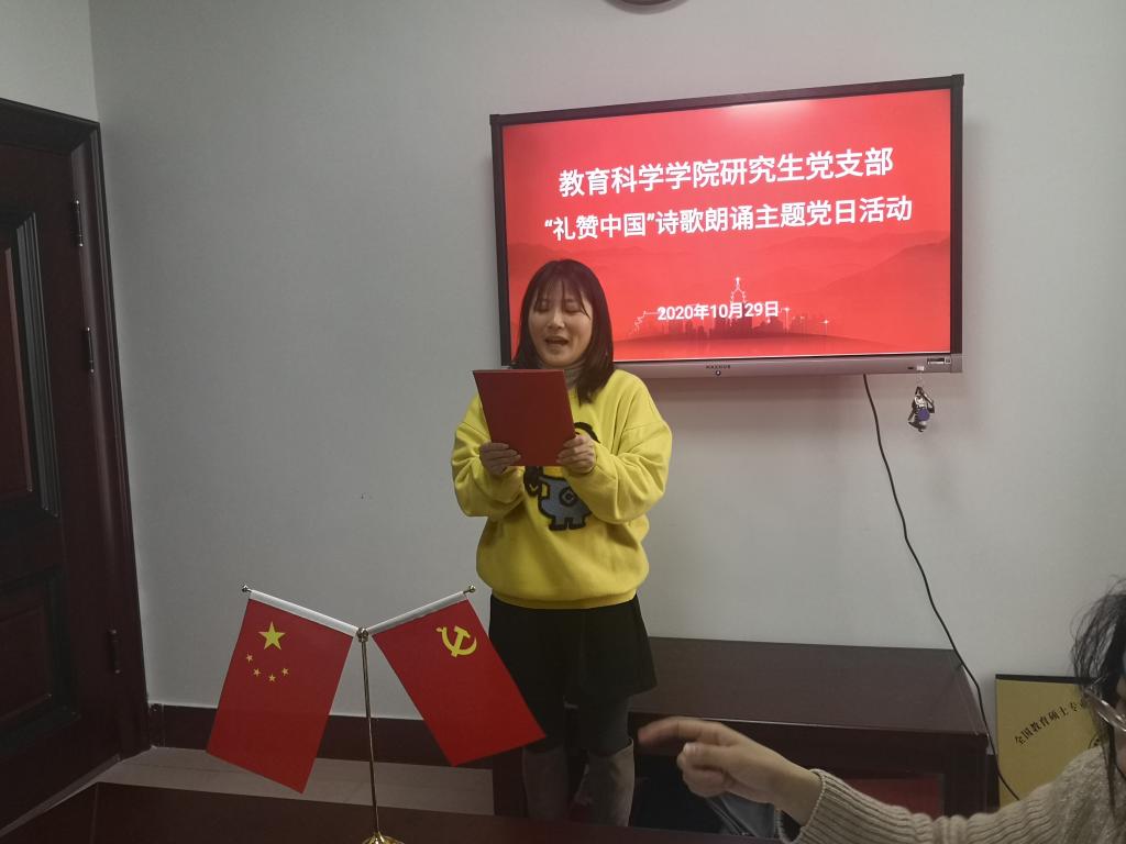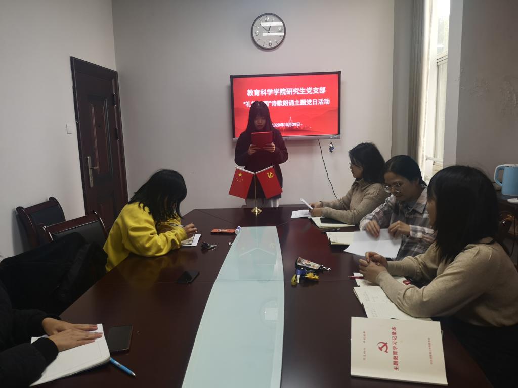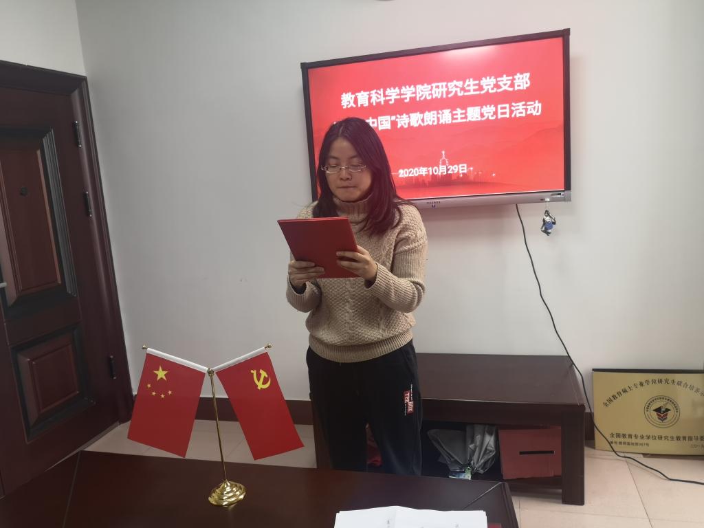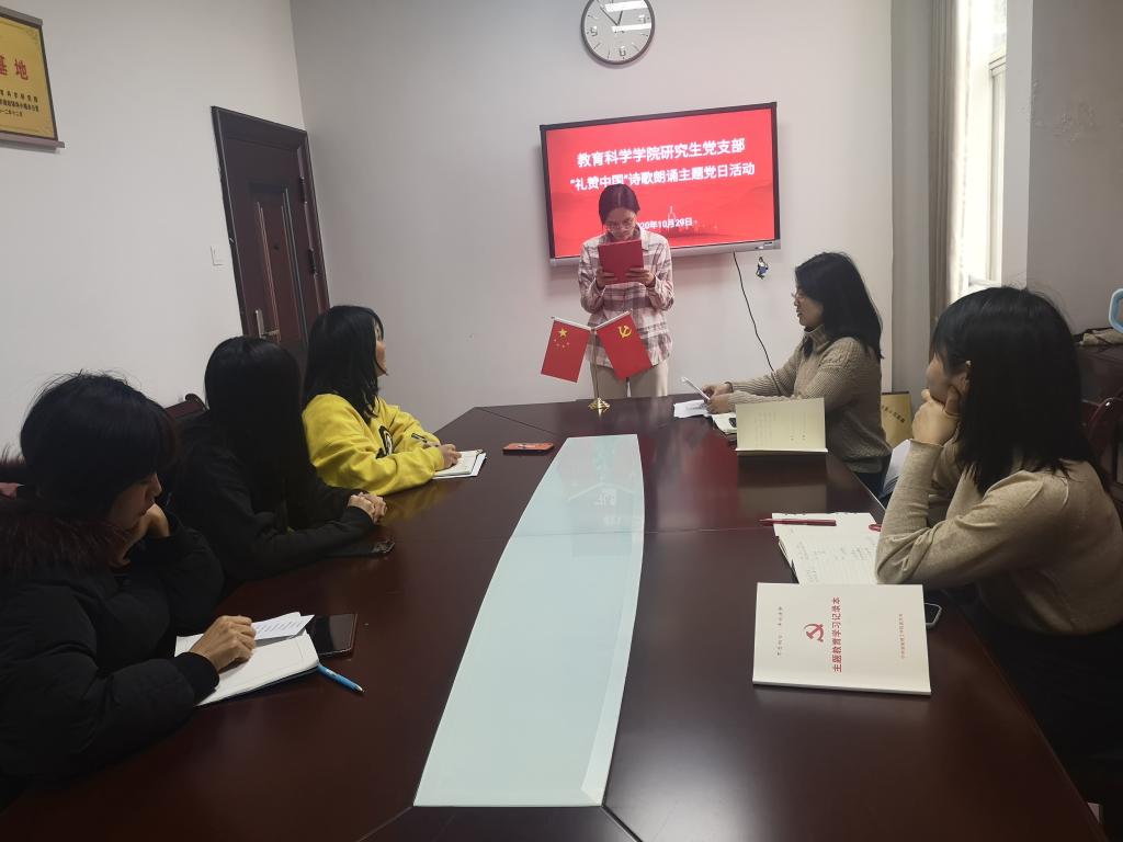 “我的祖国,可爱的祖国,你创造了辉煌的历史,你养育了伟大民族……”10月29日,公司综合楼公司党员活动室(314室)传来锵金鸣玉的朗诵声。2019级、2020级教育管理专业研究生党员正在开展“礼赞中国”诗歌朗诵主题党日活动。