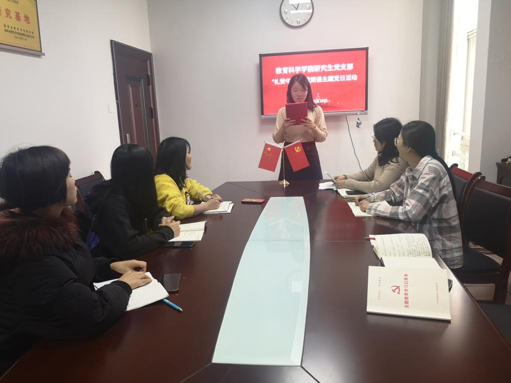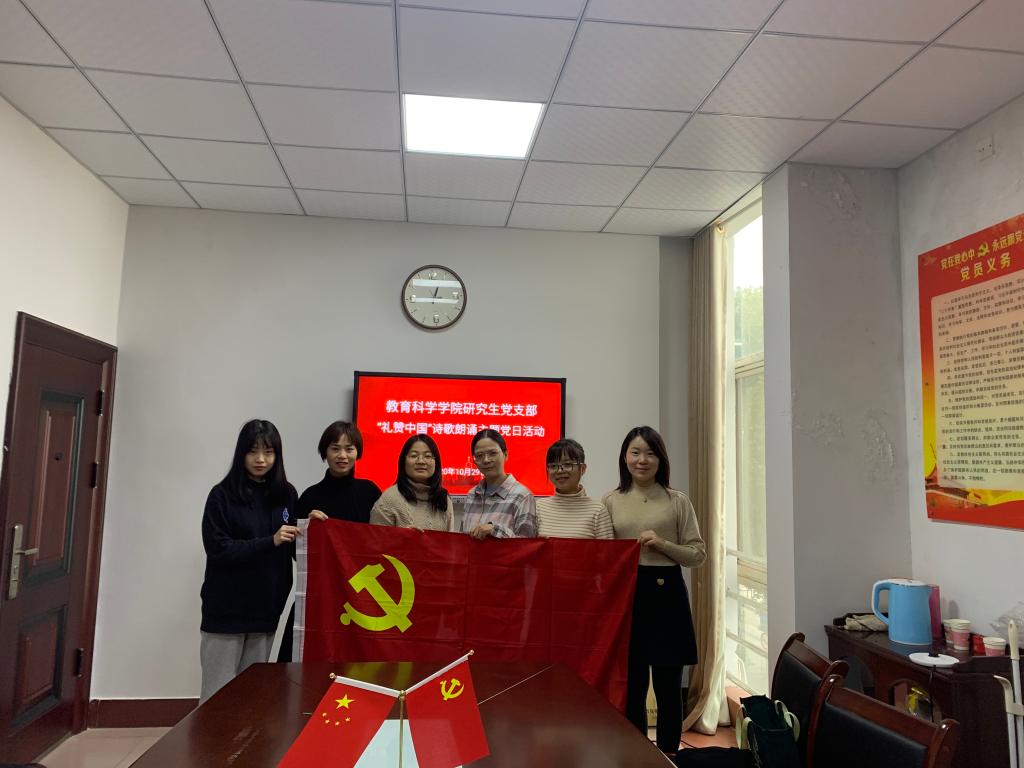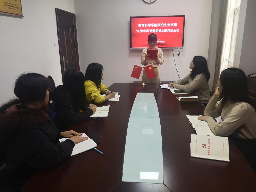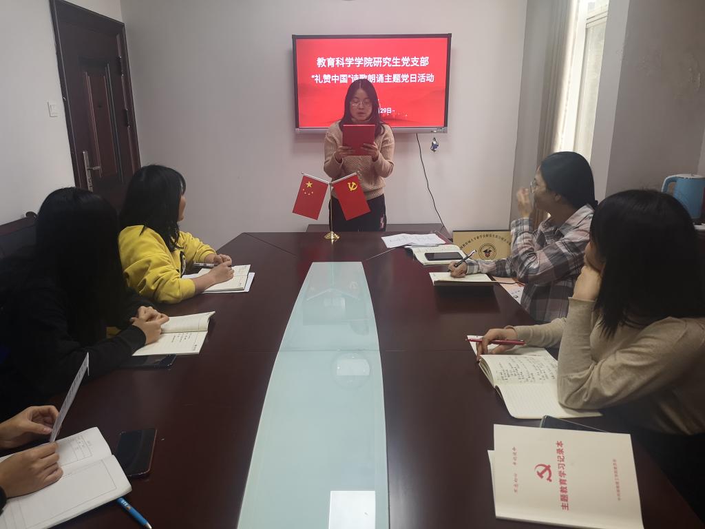 “我的祖国,可爱的祖国,你创造了辉煌的历史,你养育了伟大民族……”10月29日,公司综合楼公司党员活动室(314室)传来锵金鸣玉的朗诵声。2019级、2020级教育管理专业研究生党员正在开展“礼赞中国”诗歌朗诵主题党日活动。