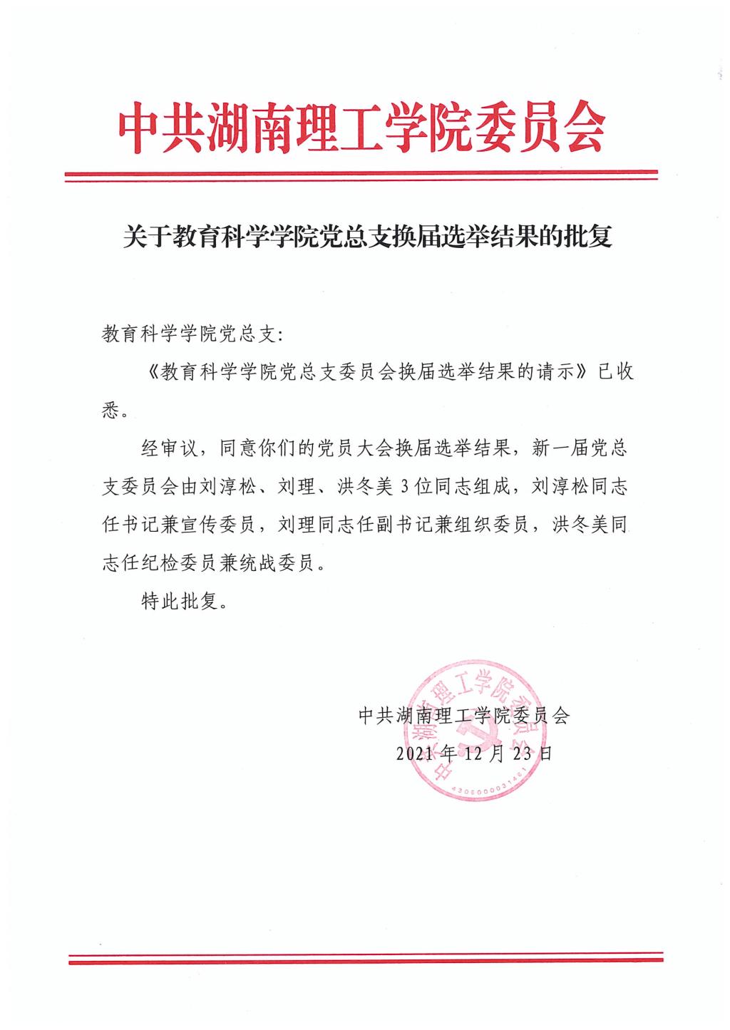 近日,公司党总支收到公司党委12月23日印发的《关于公司党总支换届选举结果的批复》。批复同意公司新一届党总支委员会由刘淳松、刘理、洪冬美3位同志组成,刘淳松同志任书记兼宣传委员,刘理同志任副书记兼组织委员,洪冬美同志任纪检委员兼统战委员。