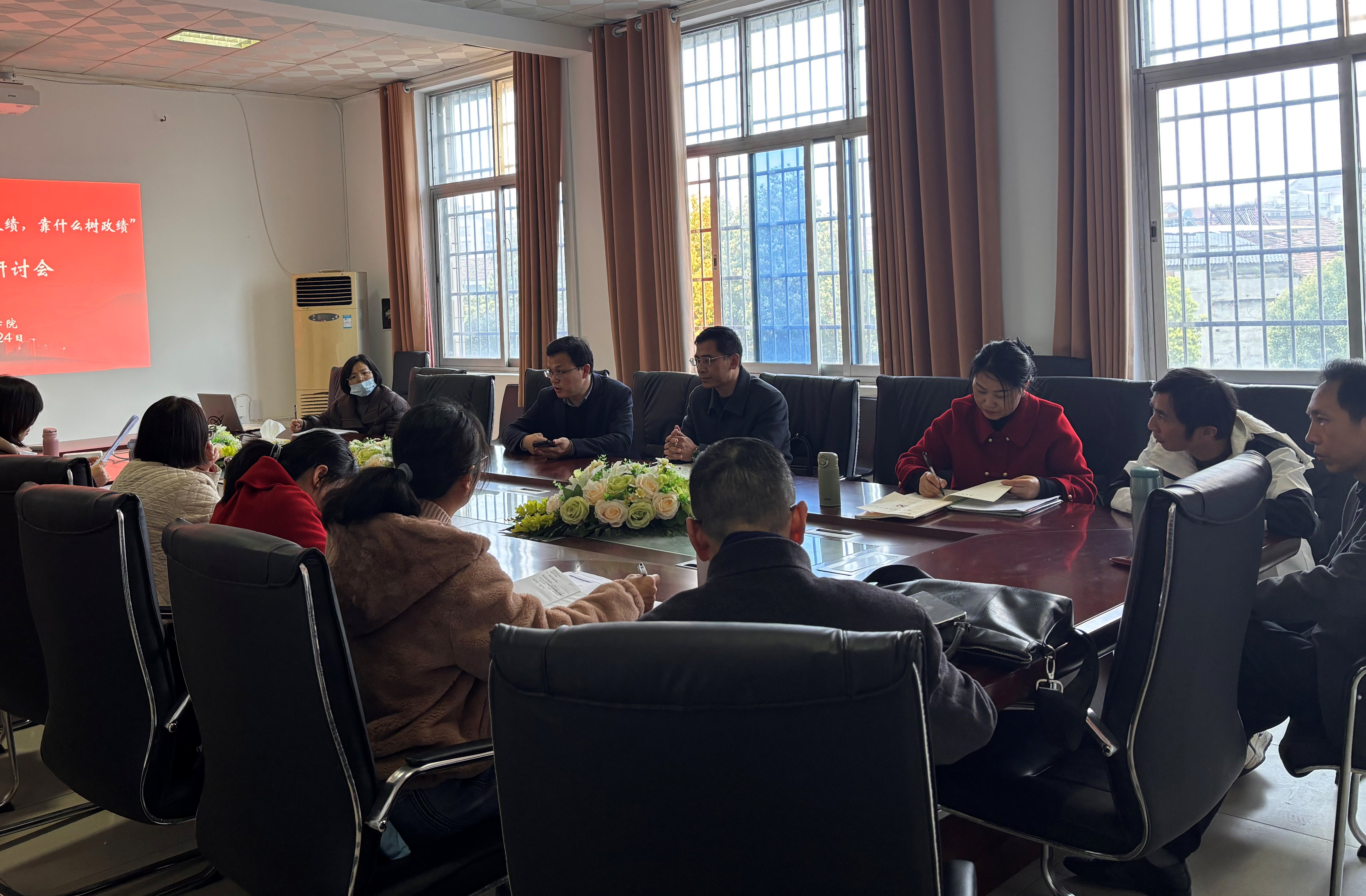 3月24日下午,公司1号教学楼1305会议室召开党总支理论学习中心组2026年第4次集中学习(扩大)暨“政绩为谁而树、树什么样的政绩、靠什么树政绩”专题学习研讨会。公司全体教师参加。党总支书记钟坚主持会议,主持行政工作副经理彭阳红作了中心发言。