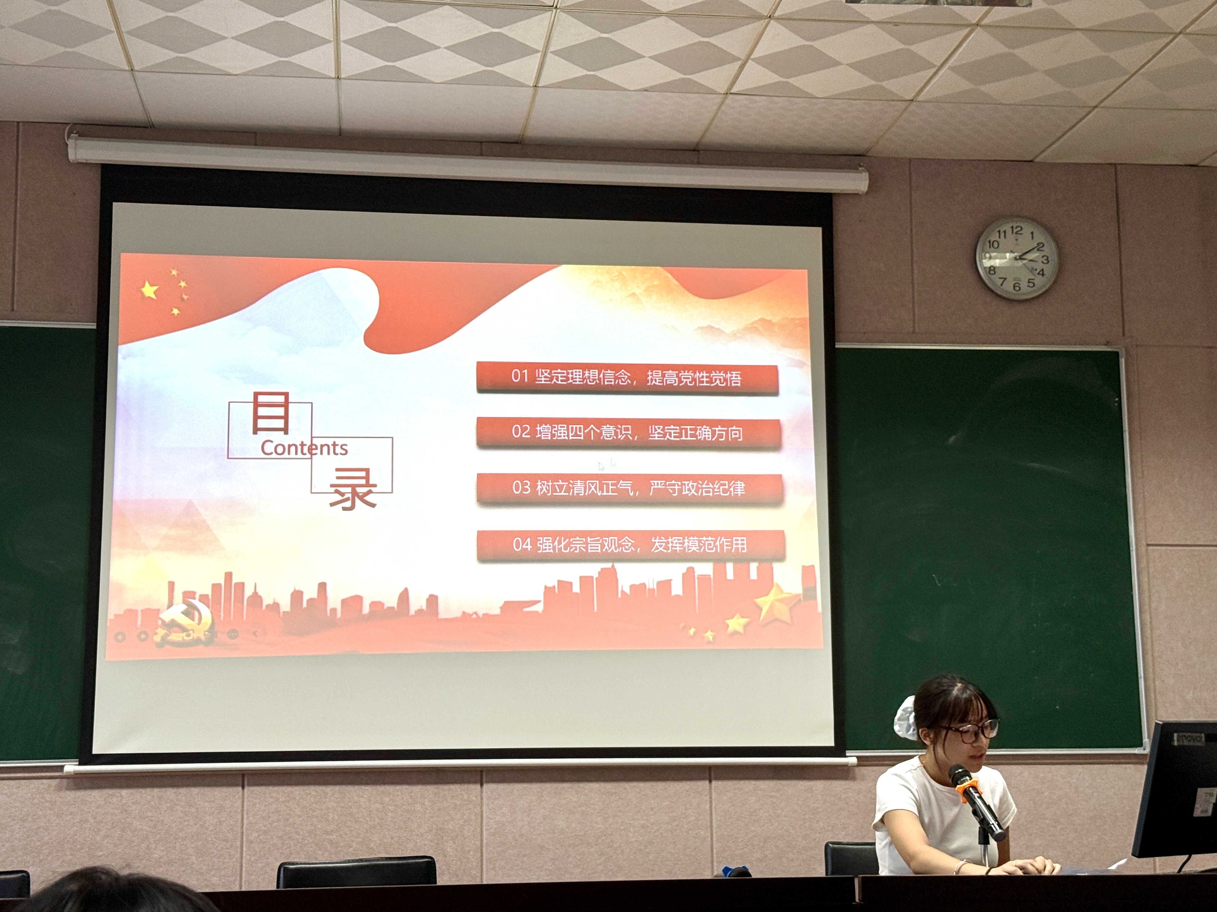 本次活动由研究生党支部副书记刘瑾、党支部组织委员张韵、班级组织委员陈星瑶主讲,活动中,刘瑾以“教育家精神 感动时代的星火”为题,用教育故事点亮新生对教育事业的崇敬;张韵聚焦“强信念、树正气、践宗旨”展开讲解,明确新生以纪律规矩立身行事、主动向党组织靠拢的决心;陈星瑶以“信仰为舵,奋斗为桨——在新征程上共筑青春梦想”为切入点,寄语新生以实干书写青春答卷;新生党员李颖分享自身从普通老员工成长为共产党员的经历,诠释新时代党员的责任与担当。