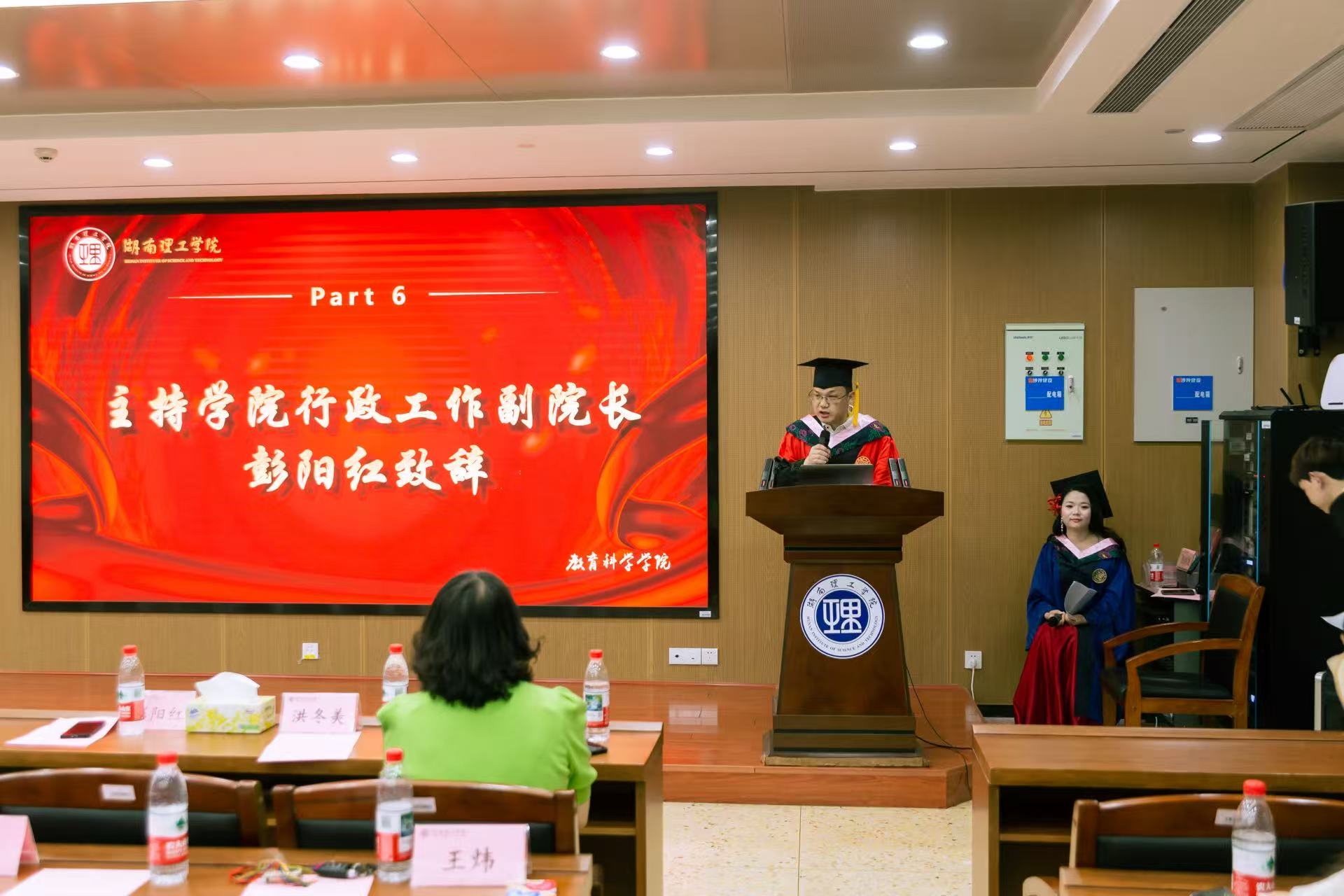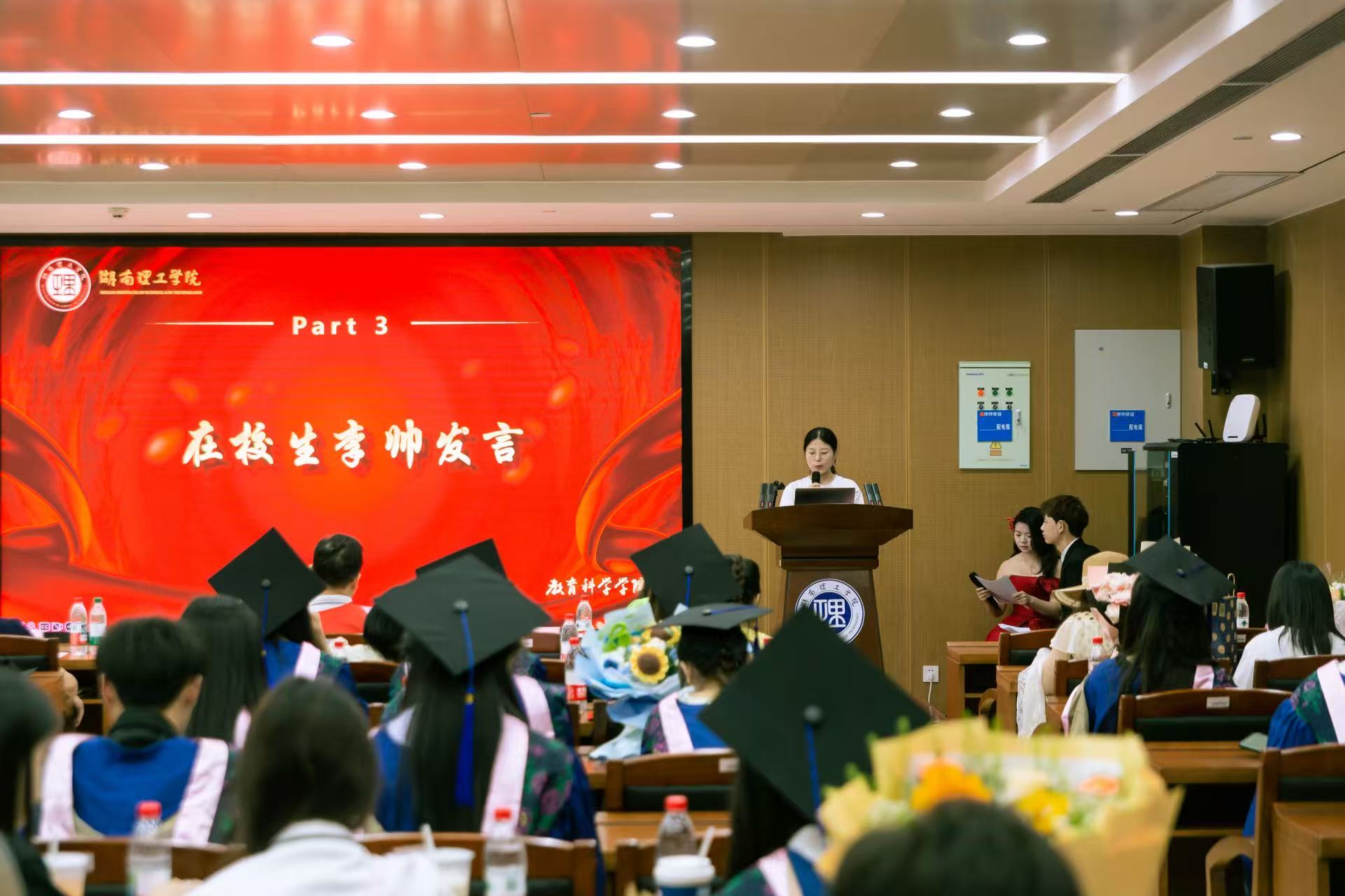 在热情洋溢的致辞中,彭阳红对毕业生圆满完成学业表示热烈祝贺,肯定了毕业生的在校贡献,寄望毕业生牢记校训,以湖理为基,勇敢逐梦,保持“以人为本”的初心,在时代浪潮中书写精彩人生。