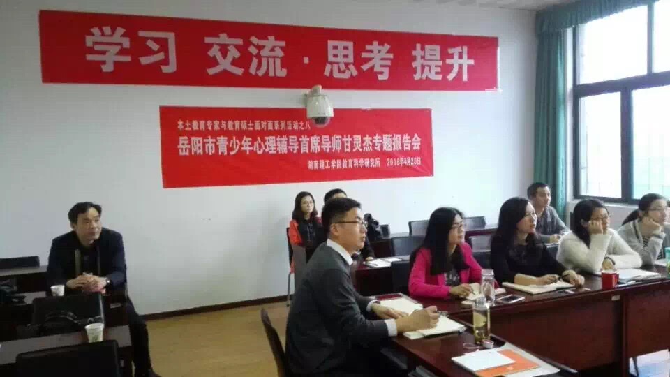 4月20日上午,岳阳市首席青少年心理辅导专家、慧腾青少年成长公司董事长、湘阴县政协副主席甘灵杰老师走进公司1303A教室,给公司教育硕士研究生做了一场题为《还世界一点颜色》的讲座。教科所、研究生处相关负责人,全体教育硕士研究生听取了讲座。