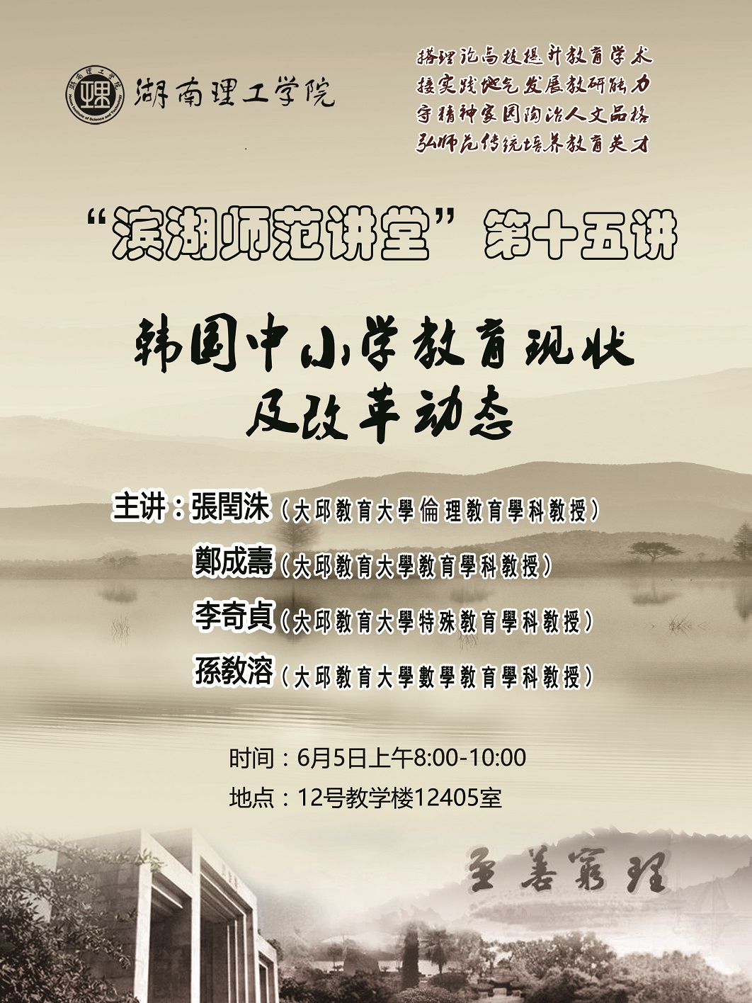 6月5日,以韩国中小学教育现状及改革动态为主题的“滨湖师范讲堂”第十五讲在12405教室举行,来自韩国大邱教育大学的张闰洙、郑成寿、李奇贞、孙教溶等四名教授联袂主讲。公司国际交流处陈钰处长、教科院刘理教授、刘淳松教授、卢晓红副教授及部分教育硕士参加。交流会由教科院经理刘理主持,外国语公司朴美玉老师担任韩语翻译。