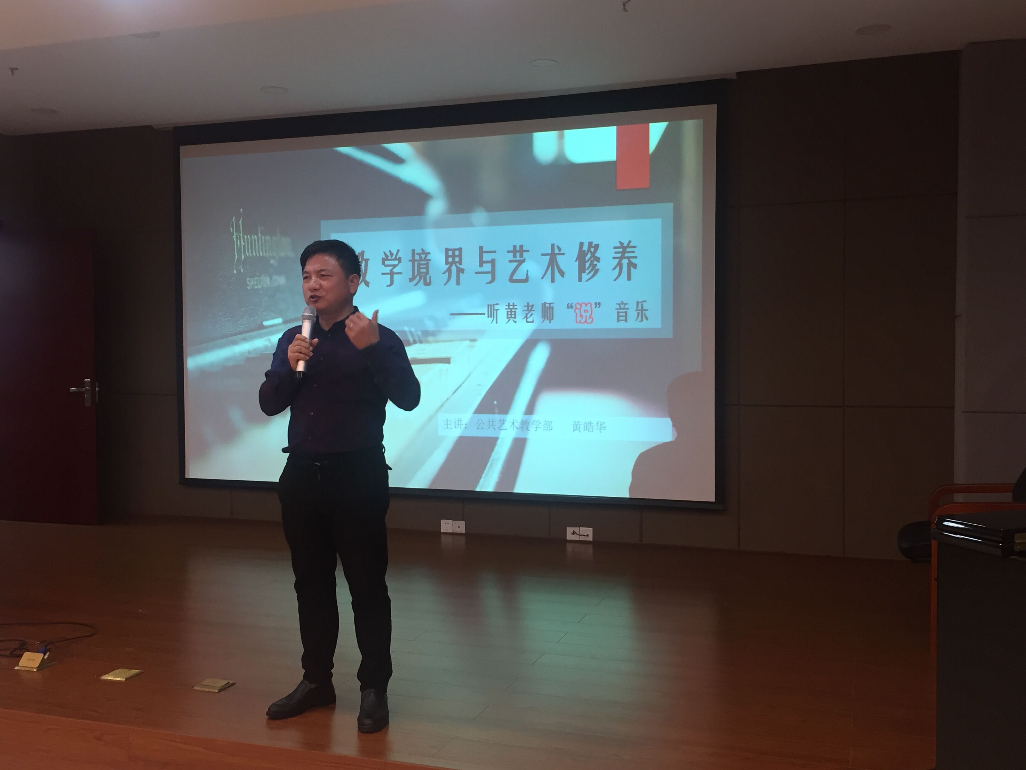 黄皓华副教授从“说”音乐知识、音乐水平、到识简谱以及提升个人艺术素养四个方面让我们了解到音乐是人类社会历史发展长河中的一种文化环境,是乐音或噪音有机的组织,是引起人们情绪反映和情感体验的一种艺术。黄皓华与在座同学们现场进行了节拍互动和钢琴演奏。讲堂气氛活跃、欢快,同学们沉浸在黄教授风趣幽默似的教学中。