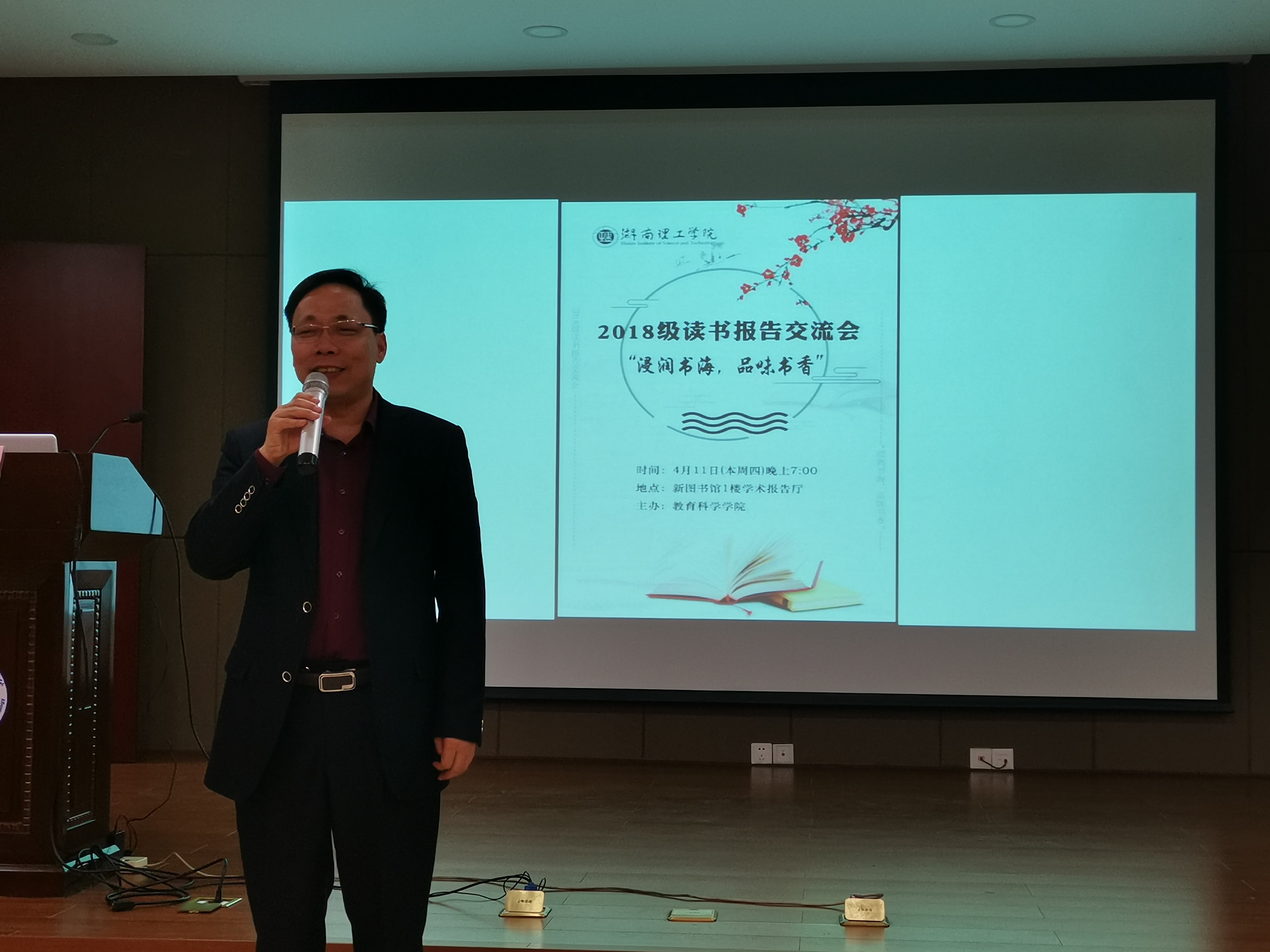 4月11日晚,MK体育在图书馆一楼多功能报告厅举办以“浸润书海 品味书香”为主题的读书报告交流会。出席本次读书报告交流会的老师有MK体育刘理教授、刘淳松教授、谢晶博士、黄威博士、王炜老师,研究生院付亚子老师,数学公司陶霞老师,政法公司贺志韧老师和2018级全体教育硕士专业学位研究生。