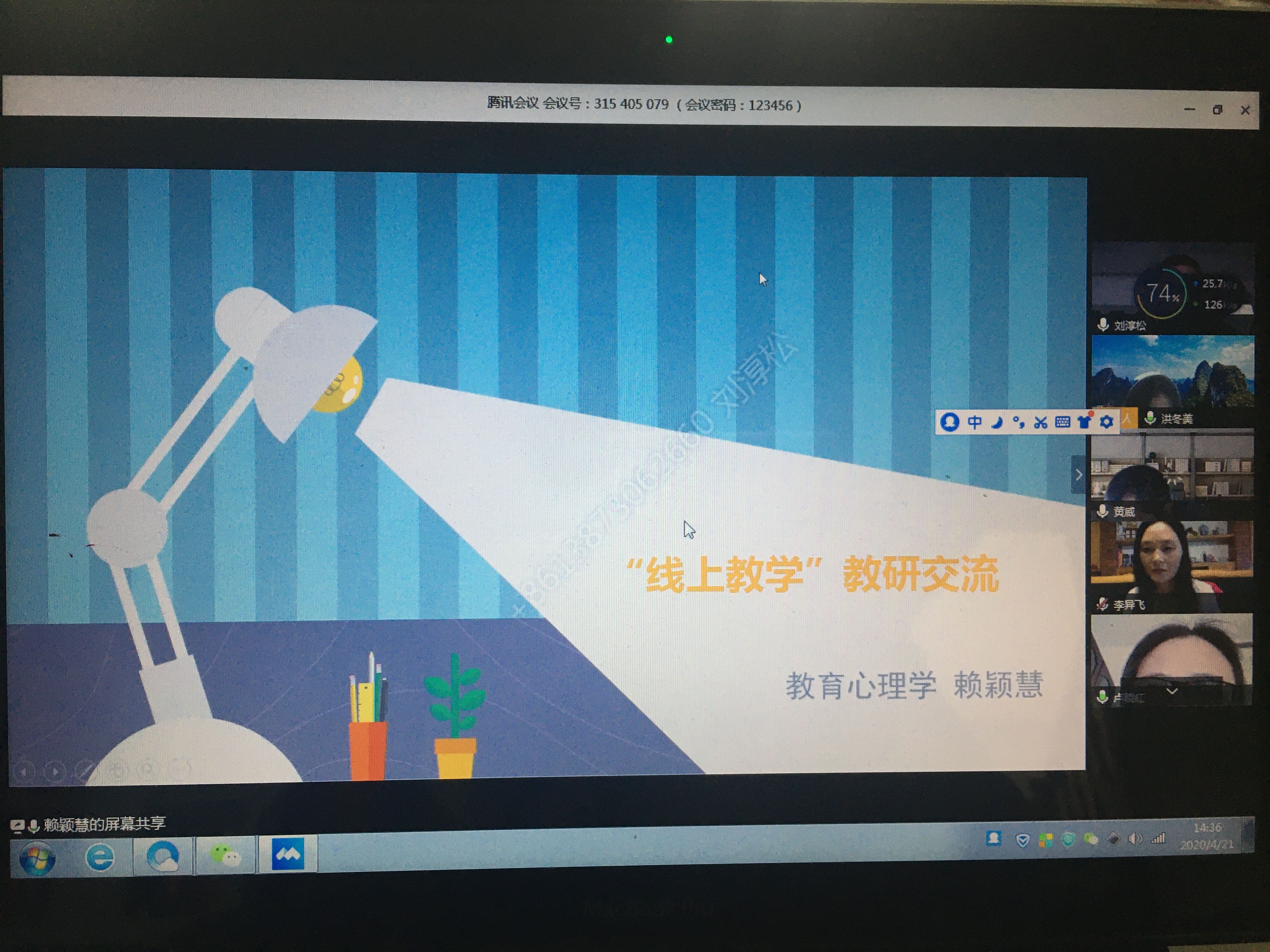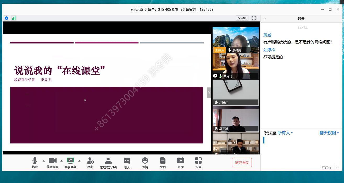 赖颖慧和李异飞两位老师分别做主题发言。赖老师以“线上教学的教研交流”为题介绍自己《教育心理学》课程的线上教学思路,并回放一段自己线上课堂教学实录,提出了改进线上教学效果的设想。李老师以“说说我的‘在线课堂’”为主题详细地阐述了自己任教的《教育政策法规与教师职业道德》课程线上教学的设计思路、教学体会与反思。