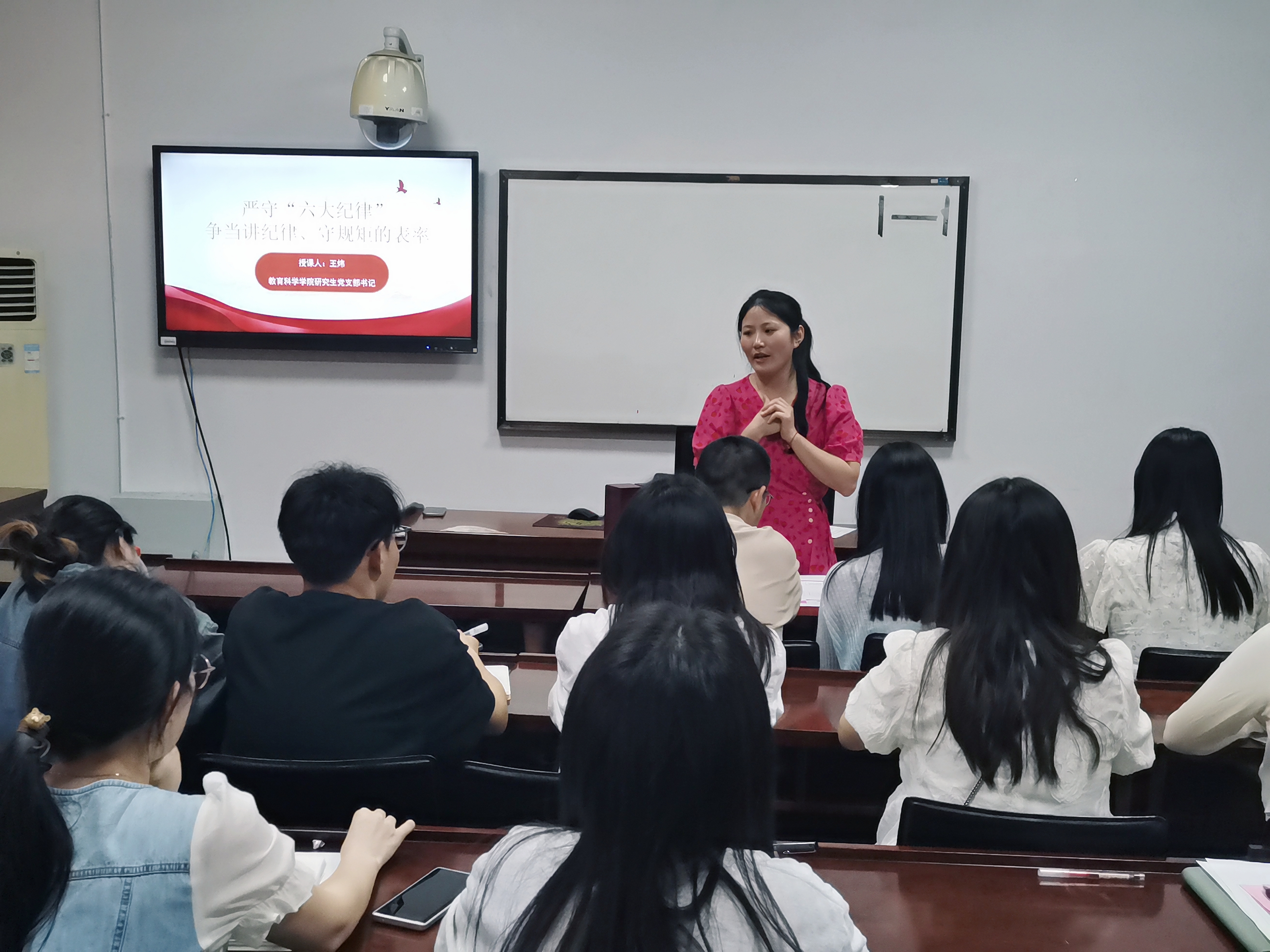为了进一步强化全体党员干部的纪律意识和规矩意识。5月28日下午,教科院研究生党支部在1号教学楼1303B教室开展党课教育,本次党课以严守“六大纪律”为主题,由研究生党支部书记王炜主讲,全体研究生党员参加学习。