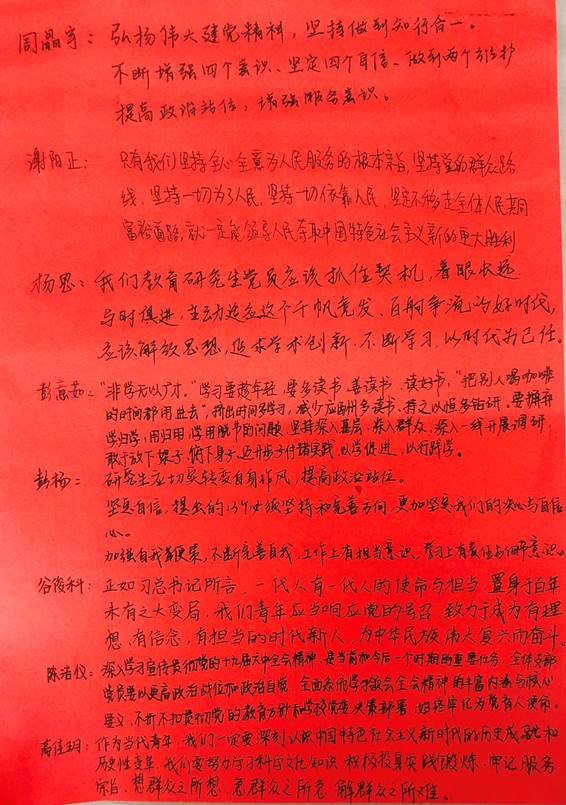 王炜对研究生党员的学习情况给予充分肯定。她指出,大家通过学习党的十九届六中全会精神,要从党的百年奋斗历程中汲取奋进新征程的智慧和力量,进一步提高政治站位,充分认识党领导的重要性和独特优势,深刻把握党百年奋斗的历史逻辑、理论逻辑、实践逻辑,敢于担当、勇于奉献,为实现中华民族伟大复兴的中国梦不懈奋斗。(供稿:周晶宇、彭杨)