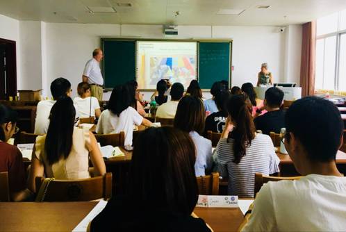 Professors Christy & Ed Austin两位教授从美国的教育架构、《独立宣言》及杜威的教育思想三个方面展开课堂教学。首先,他们讲述了中小学的教育架构,以照片及视频的形式生动地向我们展示了美国中小公司园中教室、图书馆、体育馆、操场等基础设施的状况。接着,两位教授简要介绍了《独立宣言》中“所有人生而平等”的思想,认为每个人都享有接受教育的权利。最后,他们聚焦于美国著名教育学家杜威的教育思想及其影响,推崇 “以员工为中心”以及“Learn by doing”的教学理念,强调教育的实用性。
