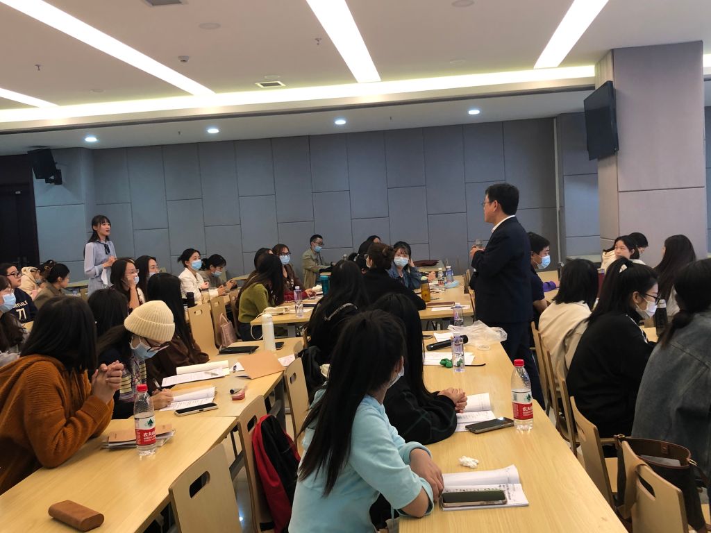 陈映军结合党的二十大精神从“做立德树人的教师”、“做德智体美劳‘五育并举’的教师”、“做有仁爱之心的教师”、“做有扎实的专业知识的教师”四个方面来诠释新时代对教师的新要求。他说,新时代教师要落实立德树人的根本任务,将“立德树人”作为行动指南。育人的的根本在于育德,要把员工的“立德”与“立志”相结合。培养一个完整的人,必须从德智体美劳五个方面来促进员工的全面发展,除此之外,教师要重视员工体育和艺术教育。教育就是塑造人的过程,作为教师应当有着“捧着一颗心来,不带半根草去”的仁爱之心,没有爱就没有教育。他从自身出发,强调教师要具备扎实的专业知识,对教材内容做到心中有数,得心应手,练好“三字一话”,做好知识储备,提升知识素养。