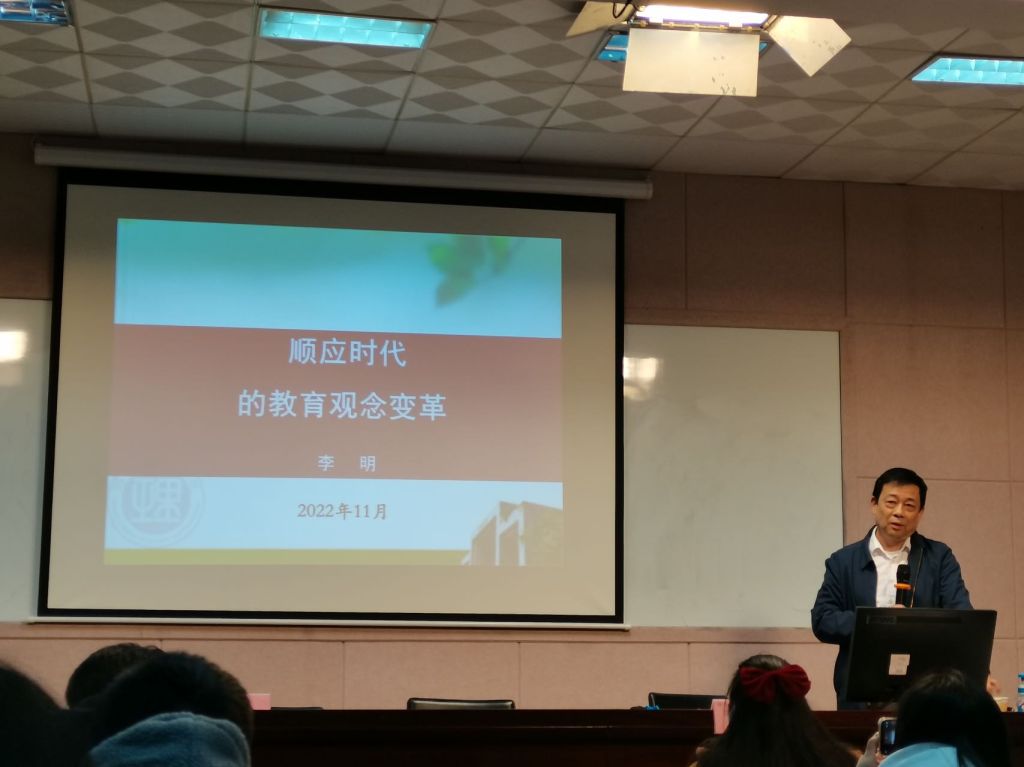 11月22日上午,MK体育举办的滨湖师范讲堂第50讲1302教室开讲。湖南理工公司党委原书记、教育管理专业硕士生导师李明教授以“顺应时代的教育观念变革”为题为教育硕士带来一场学术盛宴。公司副经理彭阳红2022级教育硕士参加,公司研究生分会学术科研部部长戴碧林主持讲座。