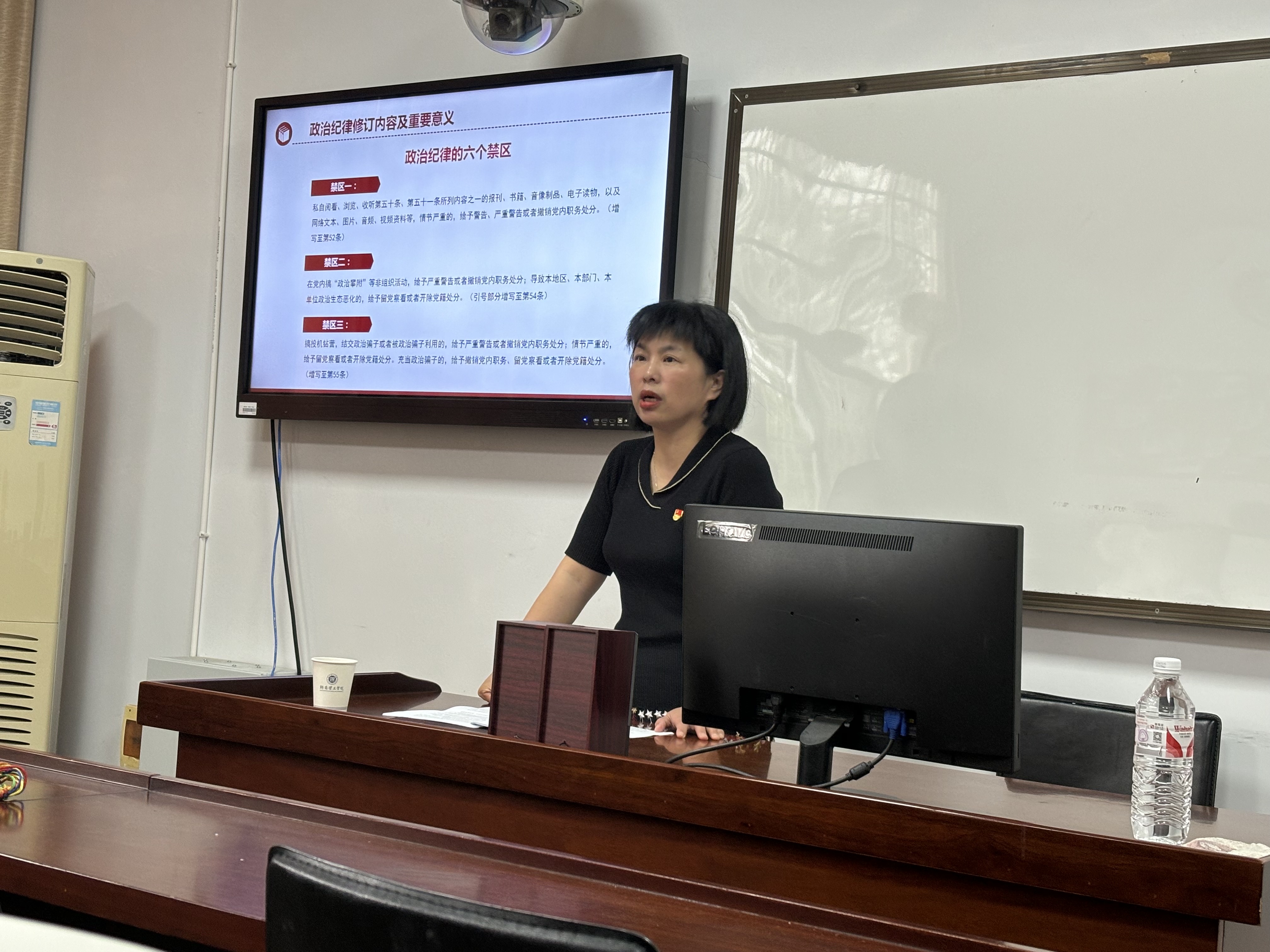 集团纪检监察处处长周红熳应邀到会,就新《条例》作了专题辅导报告,她从什么是政治纪律和政治规矩、政治纪律修订内容及重要意义、违反政治纪律行为的处分、违反政治纪律的案例解析和启示等四个方面,对新《条例》第六章“对违反政治纪律行为的处分”作了详尽深入的分析解读。