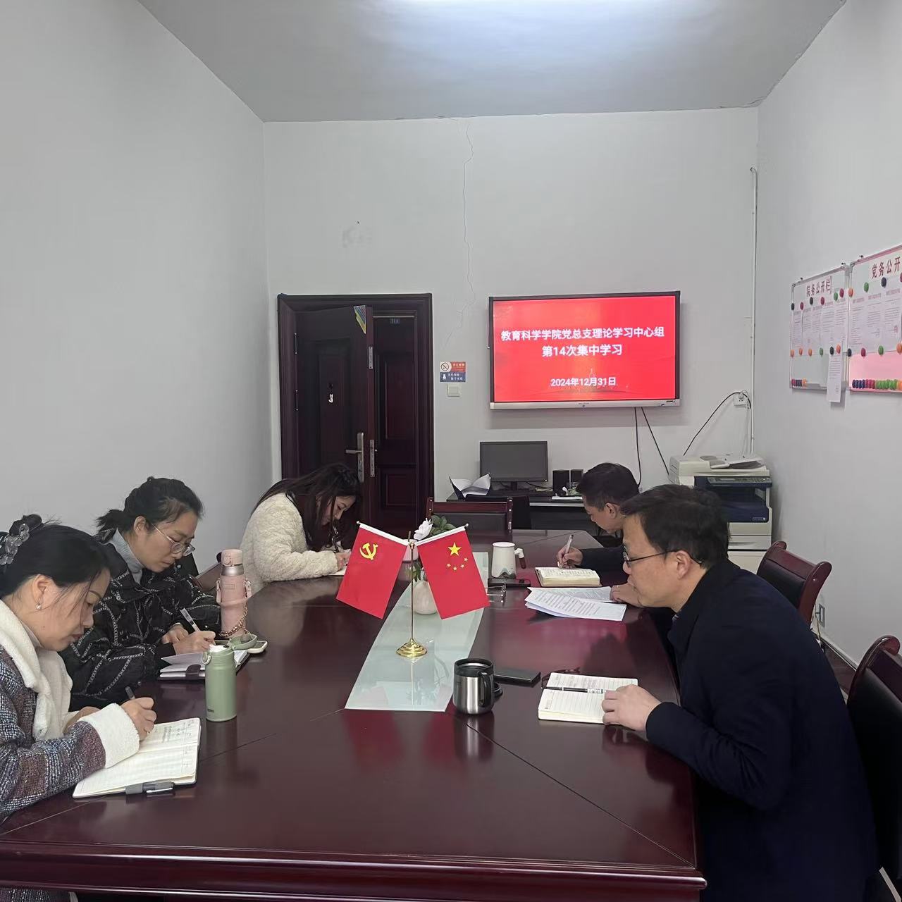 2024年12月31日下午,公司党总支理论学习中心组在综合楼2312会议室开展第14次集中学习,党总支书记钟坚主持会议并做总结讲话,主持行政工作副经理彭阳红作中心发言,党总支组织员王炜领学了习近平总书记在中共中央政治局民主生活会上的重要讲话精神,其他与会同志赖颖慧、洪冬美作了交流发言。