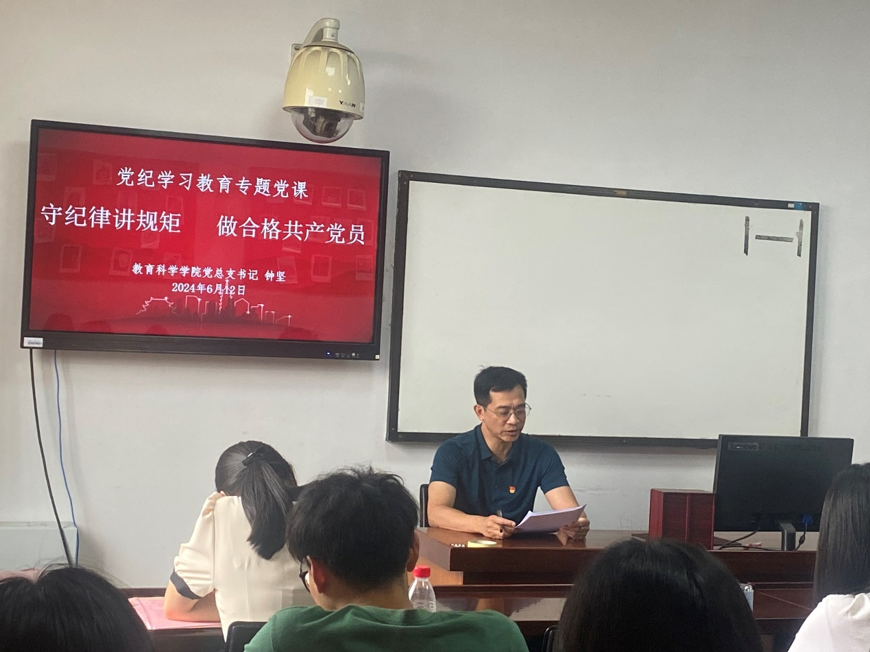 钟坚围绕守纪律讲规矩,做合格党员这一主题,结合学习思考和工作实际,与全体党员同志及入党积极分子共同学习交流。钟坚从三个方面展开:一是要明确党的纪律,全面从严治党,严明纪律规矩。对于一名党员而言,我们要明确党的纪律和规矩是“高压线”,任何违反党纪党规的行为都会受到严肃的处理;二是要全面认识党的纪律和规矩的特点,明确党纪党规是我党发展的基石。《中国共产党纪律处分条例》的修订体现了我党自我革命的坚定决心,党员同志们要贯彻学习,严格约束自身言行;三是要坚持党的绝对领导,全面认识党的纪律规矩的时代特点。深入学习贯彻习近平总书记关于加强党的纪律建设的重要论述和关于党纪学习教育的重要讲话。